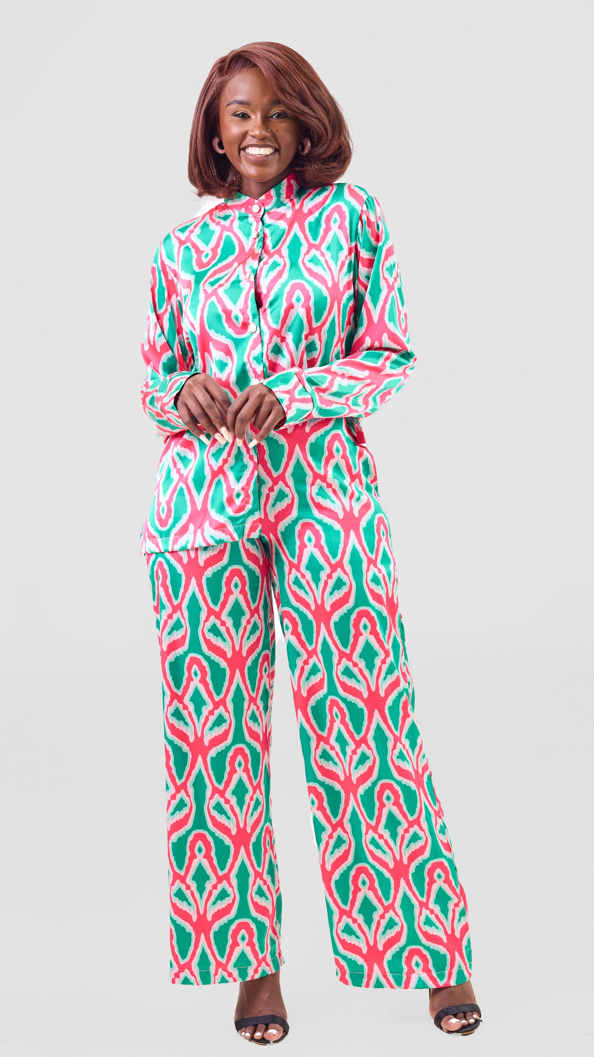 The Lulu Two-Piece Set blends sophistication with effortless elegance, making it a must-have for any wardrobe. It is a chic and versatile outfit designed for the modern woman who values style and comfort. The outfit features a long-sleeved top with a subtle mandarin neckline, offering a modern yet modest appeal. The top's tailored fit accentuates the waist, creating a flattering silhouette. Complementing the top are the elasticated waist, wide-leg trousers that elongate the legs and provide graceful movement with every step. Crafted from a premium, breathable fabric, this set ensures comfort without compromising on style. Perfect for daytime events or evening soirées, the Lulu set can be accessorized with statement jewelry and heels for a polished look or paired with flats for a more relaxed vibe. This set transitions seamlessly from casual outings to professional settings, making it a wardrobe essential.