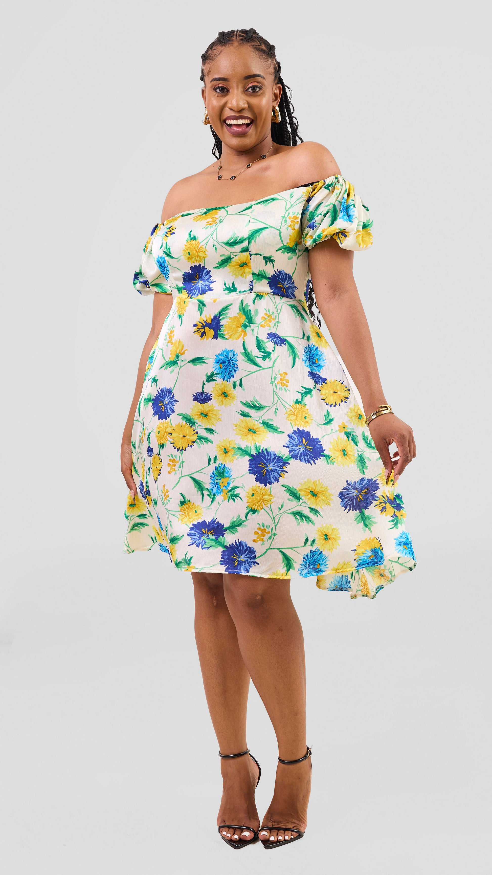 Sasha Blossom Floral Dress – Abstract White and Blue Print